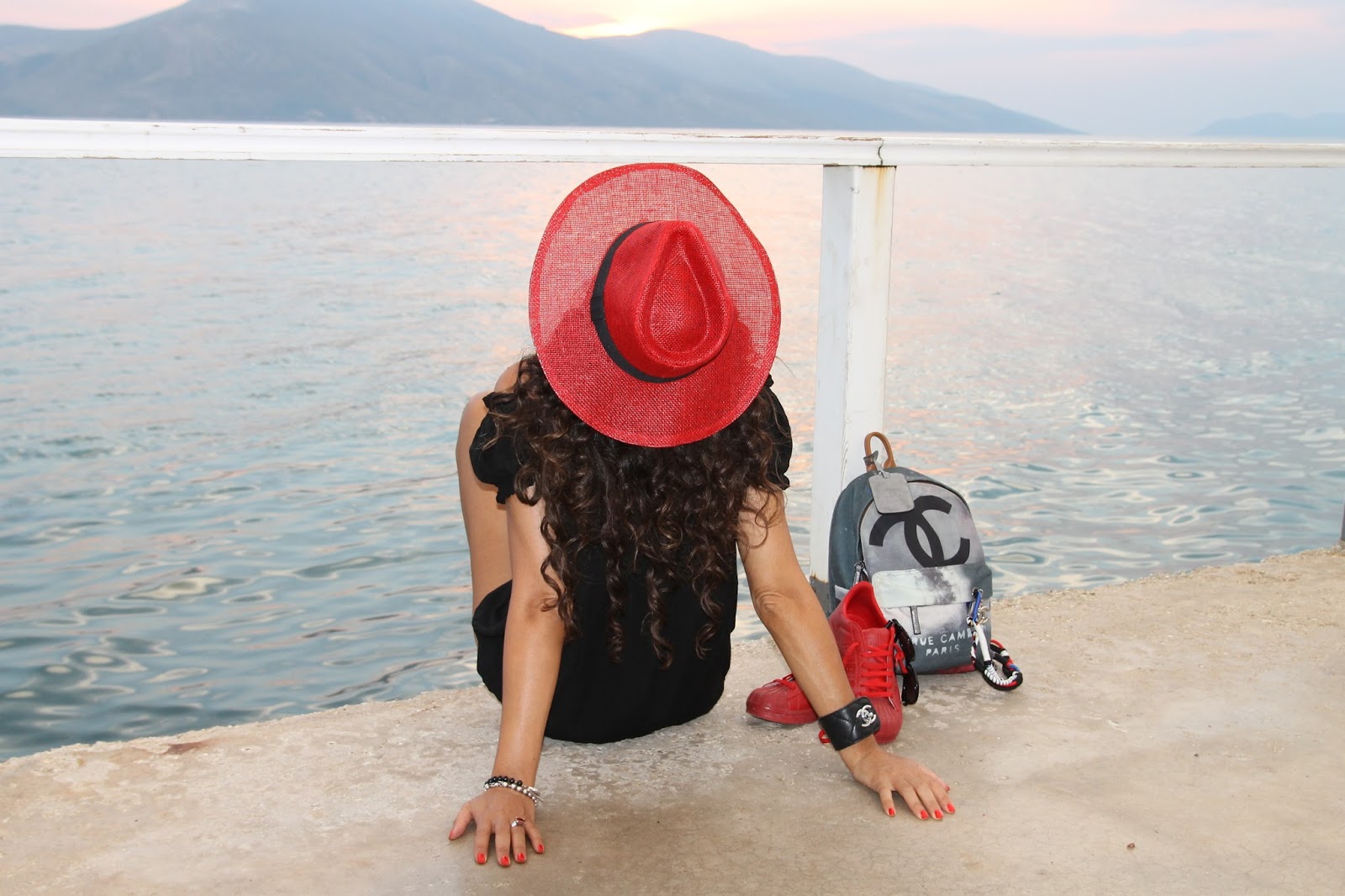Un top “off the shoulder”, un paio di shorts in pizzo, un cappello di paglia, un comodo backpack e le mie Adidas rosse “Supercolor”.